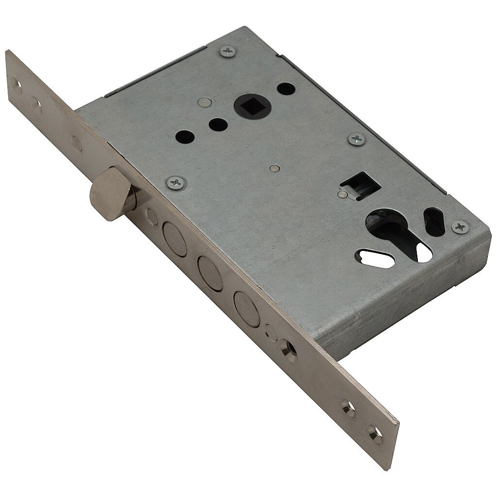 Описание: Замок врезной под цилиндровый механизм с защелкой, предназначен для установки в металлические двери. Количество ригелей - 3, вылет ригелей - 22.8 мм, количество точек запирания - 1.